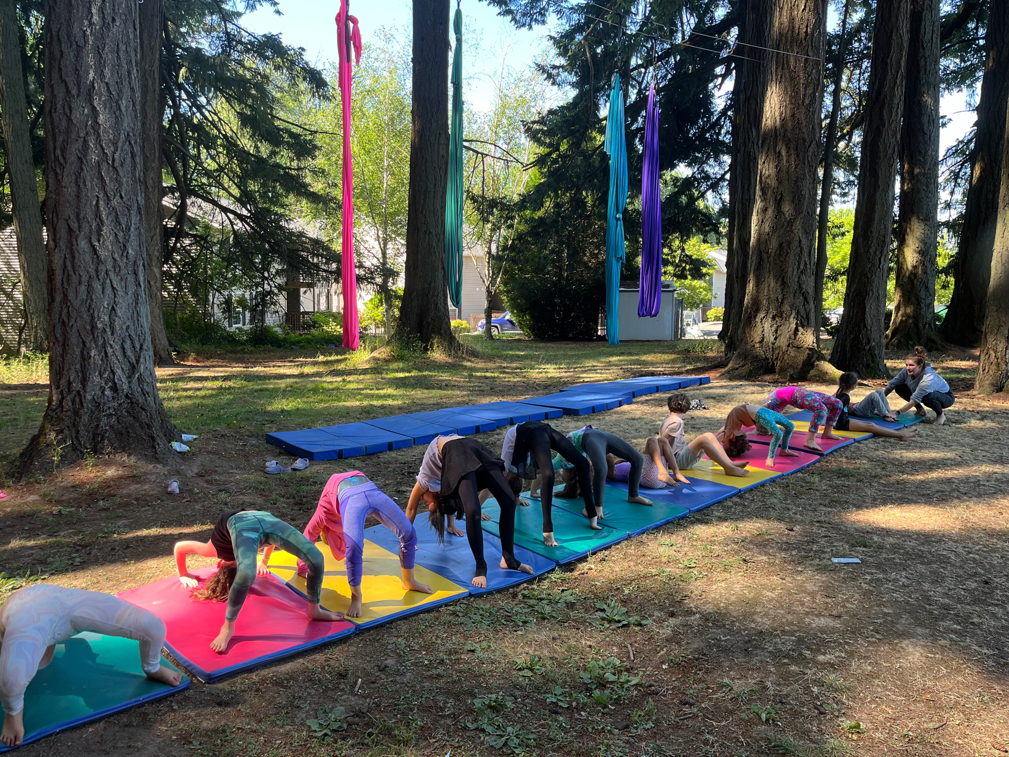 Our Outdoor Aerial Circus Camp transforms the open air into a vibrant training ground for young aerialists and circus artists. Set up under the sky in our summer yard space at the McMinnville Grange, campers will explore aerial silks, sling, hoop, trapeze, specialty apparatus, and tumbling/ ground circus skills in a safe, structured, and joy-filled environment.